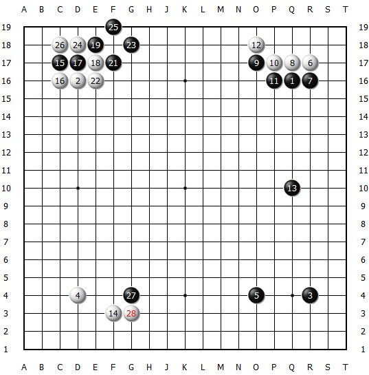 狗咬狗第28局,前14手也是跟第8局完全一样,第15手黑棋变招点三三。